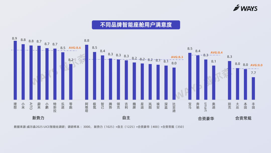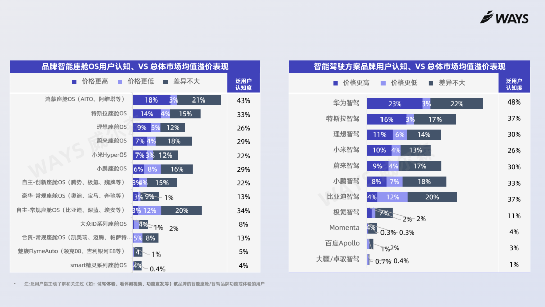 豪华、合资阵营智能化认可度不足:豪华、合资品牌虽然在品牌认知及溢价方面具备优势,但尚未探索出泛用户认知的智能座舱体验,泛用户认知度及溢价水平都处于低位;而智驾层面,其主流合作的智驾方案商泛用户认知度有限,需结合品牌人群偏好,提升智驾功能的宣传声量,以实际体验引导用户建立对品牌智驾的认知。