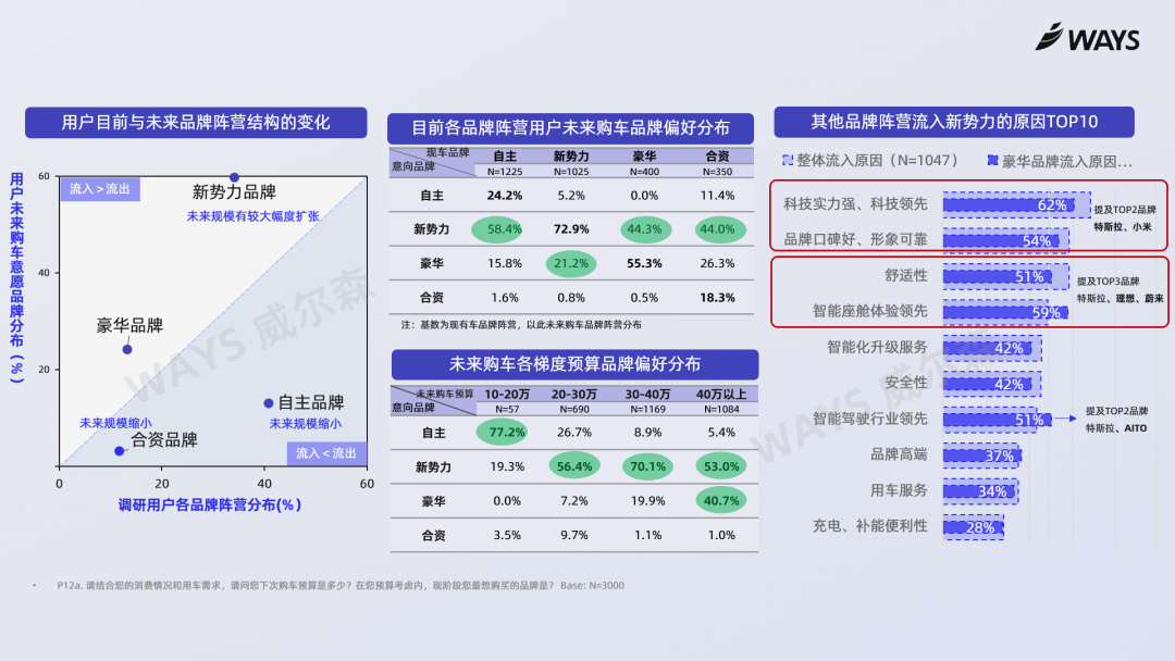 未来购车意向格局分化趋势显著,自主品牌在10-20万市场基盘稳定,自主品牌车主未来增换购流向新势力品牌比例最高(58%),豪华品牌次之(16%);20万以上区间新势力品牌认可度高,新势力品牌阵营凭借技术迭代与服务升级,将成为用户迁移的核心阵营;豪华品牌在40万以上价位段仍有较高比例的用户基础。