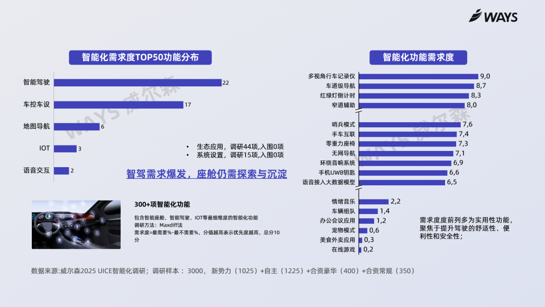 在此背景下,随着智能化功能日趋丰富,用户需求是否存在显著差异?各新兴场景所涉功能的需求度是否处于较高水平?哪些功能的用户需求度较高,哪些又相对较低?