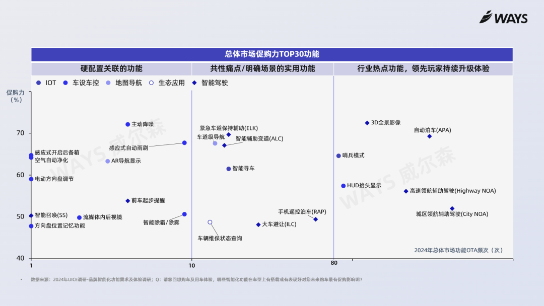 ③领先玩家持续升级体验的行业热点功能:具备宣传声量,功能热度高时上车,用户会更为关注,如:哨兵模式、自动泊车、高速NOA、城区NOA等。