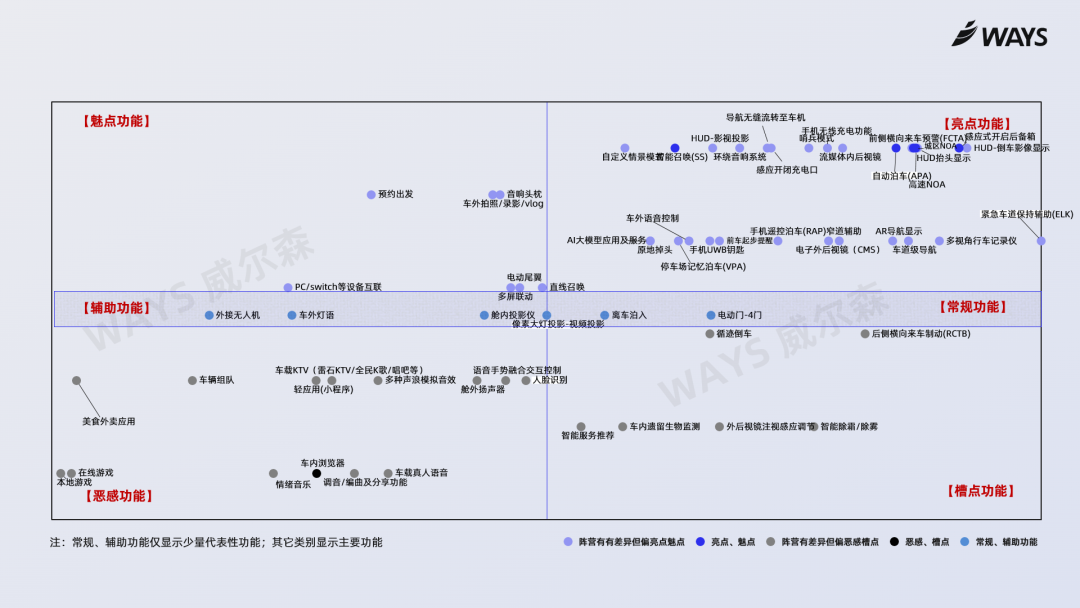 ②共性痛点/明确场景的实用功能:能对应解决现实场景中的共性痛点或能让用户联想到明确用途场景的功能,如:车道级导航、紧急车道保持等。